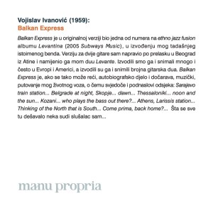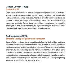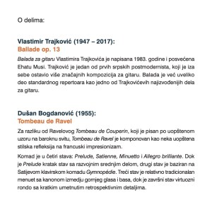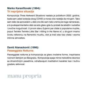 „Manu propria – srpska gitarska muzika 20. i 21. veka“ (2024) – na CD-u se nalaze kompozicije Vlastimira Trajkovića, Dušana Bogdanovića, Vojislava Ivanovića, Andreje Andrića, Marka Karanfilovskog, Damjana Jovičina i Davida Atanackovića. Izdanje je sufinansirao SOKOJ i Uprava za kulturu Grada Novog Sada.